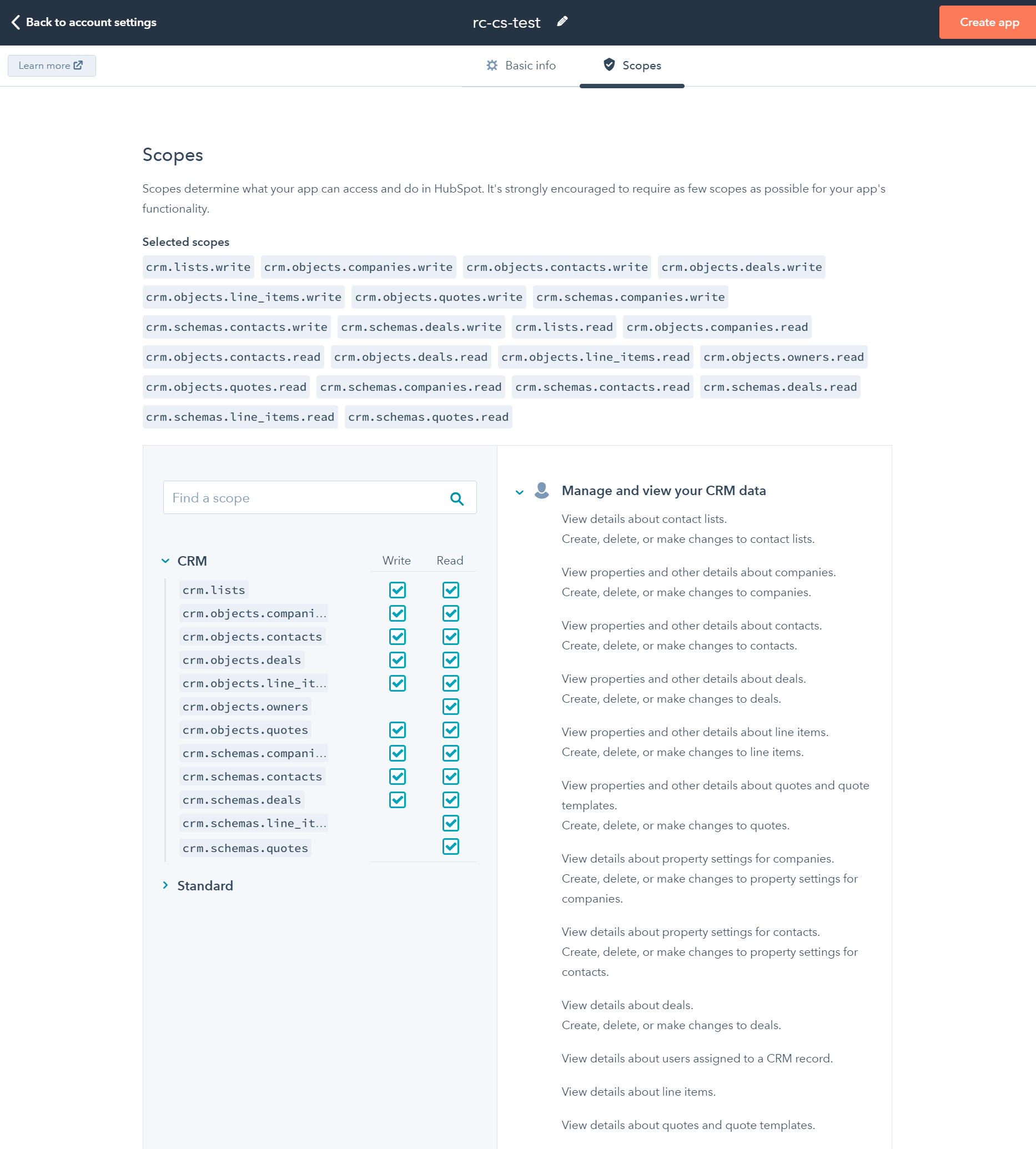 Click the Scopes tab. Search and select the Read or Write checkbox for each scope you want your private app to access. The image below highlights the scopes you should add: