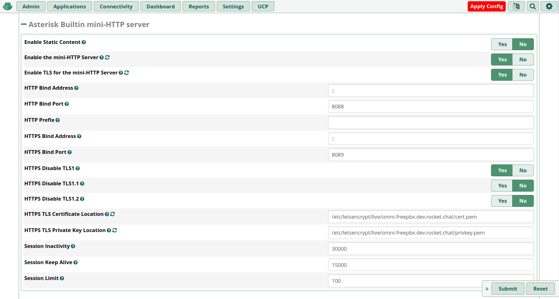 We are reusing the Let’s Encrypt certificates for the Asterisk mini-HTTP server, WebSockets, TLS encryption, and others. Start by going to Settings > Advanced Settings (again), search for the Asterisk Builtin mini-HTTP server section and, configure as shown, apply changes. Asterisk restart is also recommended here: