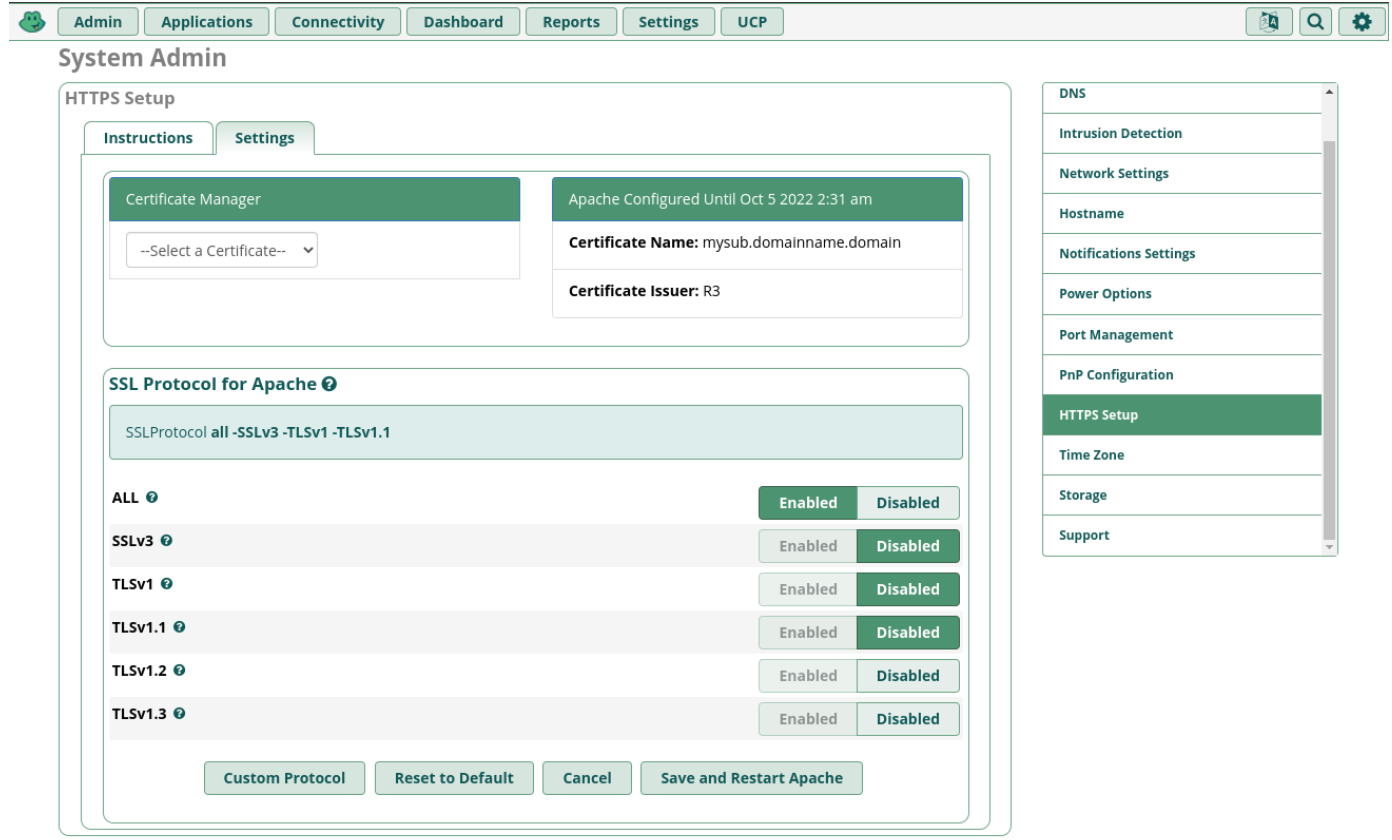 Now you can start using it. Go to the Admin > System Admin > HTTPS Setup and then to the Settings tab. Here select the certificate that was just generated and click on Install, wait, then select the Protocols TLS 1.2 and 1.3 as others are considered deprecated or insecure: