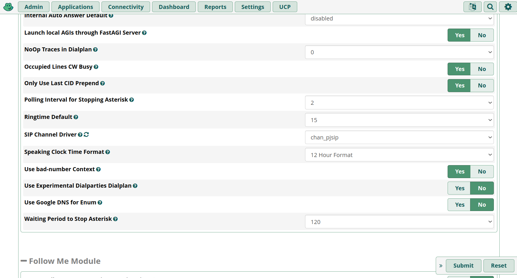 We are using chan_pjsip as the only SIP driver. Go to Settings > Advanced Settings, search for SIP Channel Driver, and choose chan_pjsip. Hit Submit.